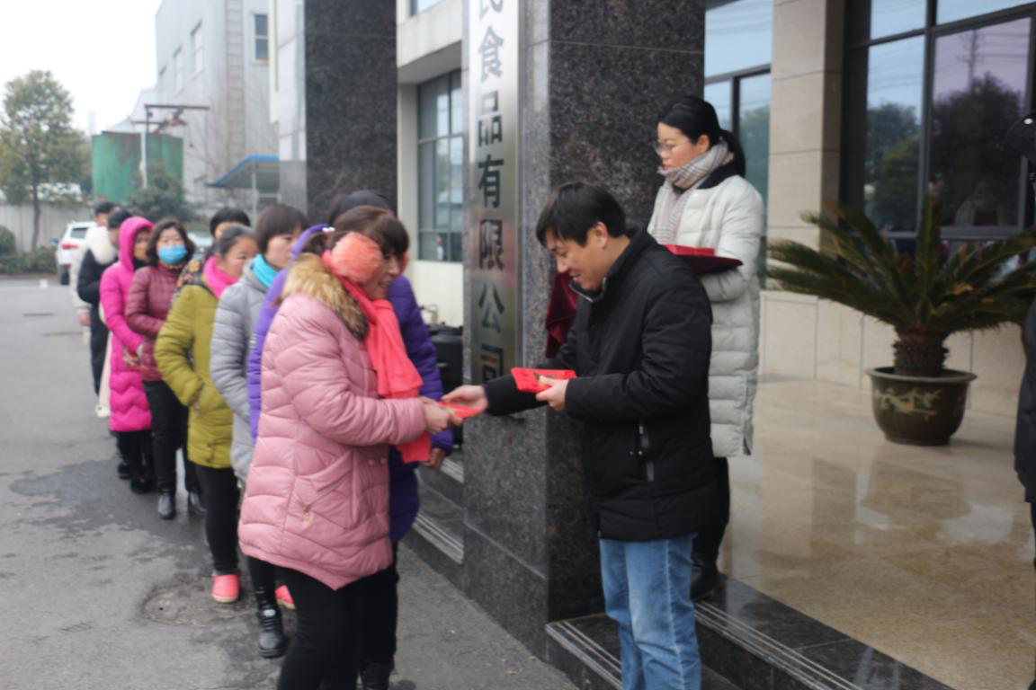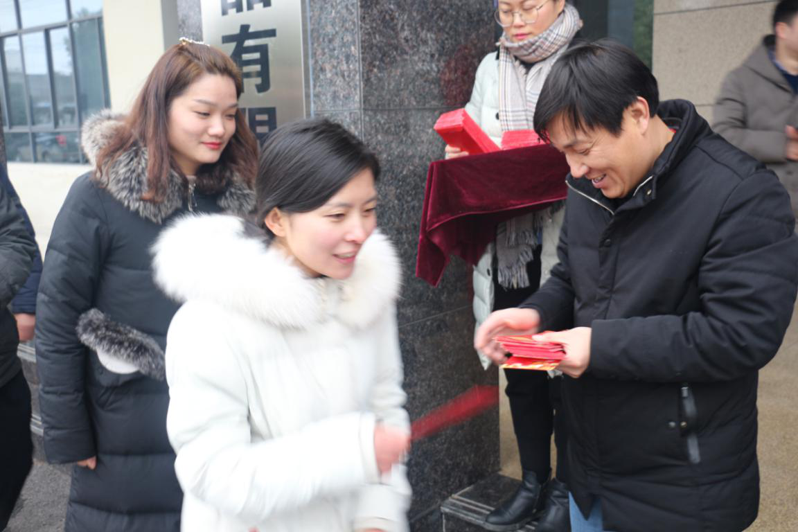 在升旗宣誓儀式結束后,彭經理在行政樓大門處親手將公司準備的紅包發(fā)到每一位